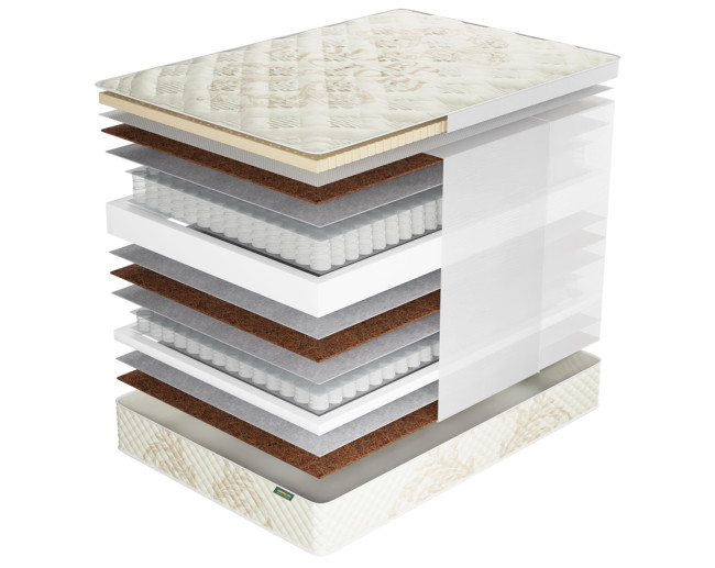 Кокосовая койра - 100% натуральный материал с уникальными свойствами. Койра,скрепленная натуральным латексом, дает объемную упругую воздухопроницаемуюструктуру. Такой материал используется в моделях, предназначенных для любителейболее жесткого и упругого спального места. Естественные вентиляционные качества,эластичность, прочность, упругость, гигиеничность и антиаллергенность, наряду сочень долгим сроком службы, делают этот материал идеальным для наполнения матраса. -
