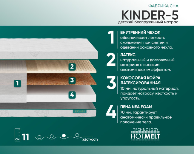 Кокосовая койра придаёт необходимую жесткость матрасу, а натуральный латекс в свою очередь смягчает поверхность, делая её сбалансированной и комфортной для здорового сна ребёнка.