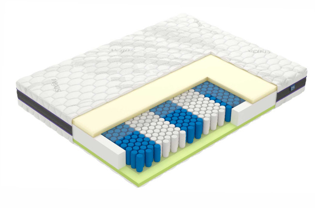 Усовершенствованный независимый пружинный блок с 7 зонами комфорта и поддержки во время сна. Пружины расположены в виде пчелиных сот, что увеличивает плотность их размещения, повышая ортопедический эффект и допустимую нагрузку на спальное место. Диаметр пружины 60 мм. Высота пружинного блока 140 мм.