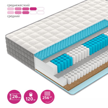 Роскошный высокий (26 см) матрас с двумя пружинными блоками: инновационной системой Smartpocket Pro 5-Zone с пятью зонами комфорта и блоком TFK Mini R1000, усиливающим ортопедический эффект матраса. Средняя по жесткости сторона выполнена из упругой пены с микромассажным эффектом, дающим дополнительное расслабление во время отдыха. Среднежесткая сторона матраса продуманно сочетает природную жесткость кокосовой койры с мягкой упругостью современной пены Smartflex.