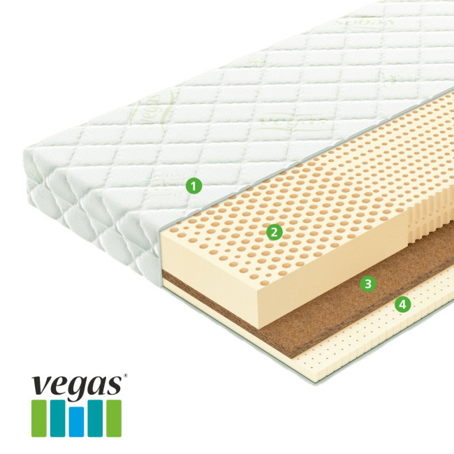 Цельный блок латекса с тремя поперечными зонами жесткости. Специальный набор отверстий различного диаметра и плотности расположения придает каждой из зон собственную жесткость. Таким образом достигается оптимальное распределение нагрузки и высокий ортопедический эффект.