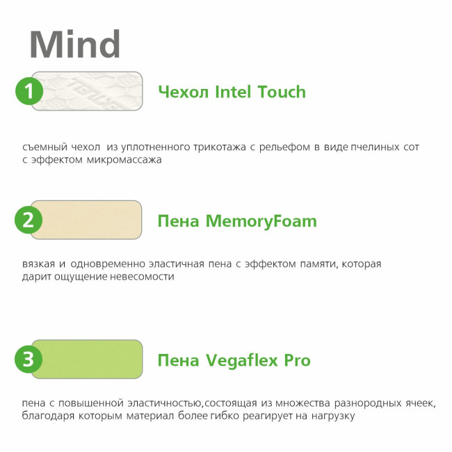 Инновационный материал с памятью формы, разработанный для нужд аэрокосмической отрасли. Обладает одновременно вязкостью и эластичностью, что дарит спящему ощущение невесомости.