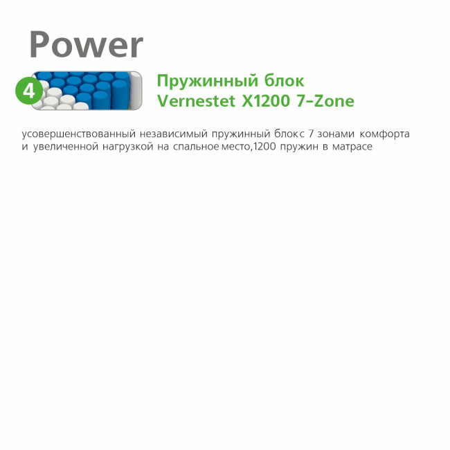 Усовершенствованный независимый пружинный блок с 7 зонами комфорта и поддержки во время сна. Пружины расположены в виде пчелиных сот, что увеличивает плотность их размещения, повышая ортопедический эффект и допустимую нагрузку на спальное место. Диаметр пружины 60 мм. Высота пружинного блока 140 мм. -