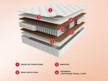 Матрас Askona Terapia Cardio состоит из 5-зонального пружинного блока, настилочных слоев из кокосовой койры и ортопедической пены Orto Foam. Поверхность пены обладает рифлением, которое обладает массажным эффектом и улучшает кровообращение в тканях организма, позволяет лучше расслабиться во время отдыха. Оба наполнителя гипоаллергенны, хорошо вентилируются, не накапливают запахи и пыль.