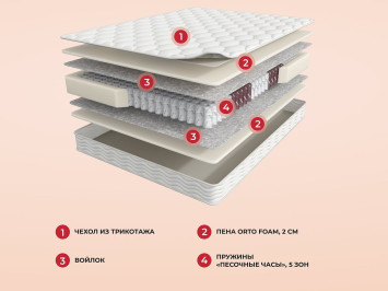 5-ти зональный пружинный блок | Независимый пружинный блок «Песочные часы Extra» с поперечными зонами жесткости обеспечивает бережную поддержку позвоночника благодаря усиленным пружинам в пяти анатомических зонах. Сбалансированное распределение жесткости по зонам гарантирует комфортный отдых c учетом анатомических особенностей спящего. |