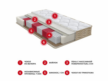 - Повышенная прочность и долговечность пружинного блока за счет использования проволоки различного диаметра. Пружины не скрипят, поэтому посторонние шумы не потревожат Ваш сон в течение ночи.
