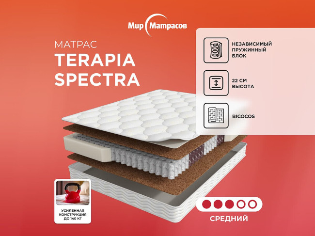Матрас Askona Terapia Spectra - прекрасный выбор для тех, кто предпочитает спать исключительно на жестких матрасах. В основе изделия – 5-зональный блок независимых пружин, благодаря которому позвоночник находится в анатомически правильном положении всю ночь. Слой натуральных волокон сизаля и кокоса отличается особой прочностью и упругостью, что улучшает уровень поддержки матраса.