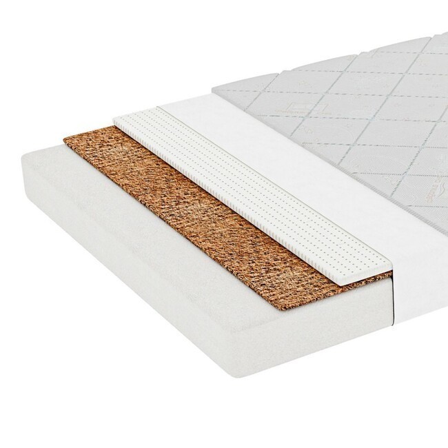 Кокосовая койра придаёт необходимую жесткость матрасу, а натуральный латекс в свою очередь смягчает поверхность, делая её сбалансированной и комфортной для здорового сна ребёнка.