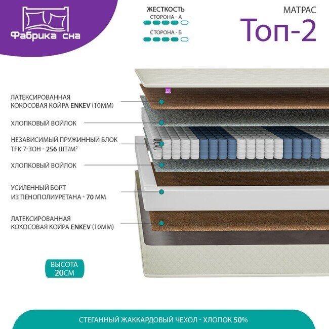 Хлопковый войлок2Защитная прослойка, отделяющая пружинный блок от мягких настилочных слоев. Предотвращает преждевременный износ компонентов.