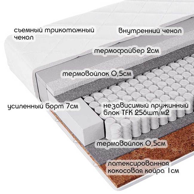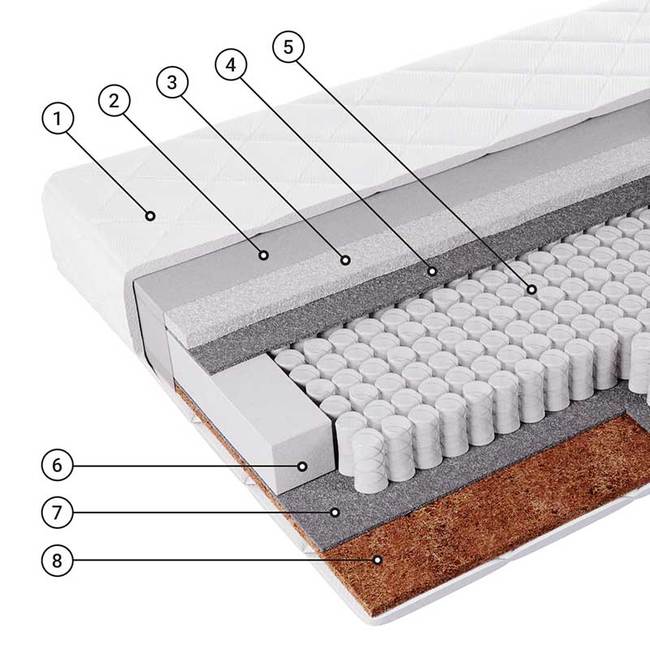 слой от изнашивания) и настилочного материала (придает матрасу дополнительную жесткость