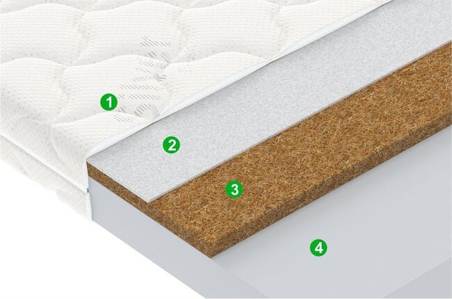 Кокосовая койра3Натуральный материал, состоящий из спрессованных волокон кокосового ореха, полностью пропитанных латексом. Слои из прочной и долговечной кокосовой койры используются для придания матрасу дополнительной жесткости.