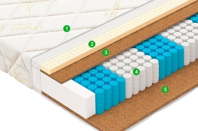 Латекс2Натуральный материал, получаемый путем вспенивания сока каучукового дерева. Мягкий, гигиеничный и хорошо вентилируемый, он обеспечивает упругую поддержку позвоночнику.