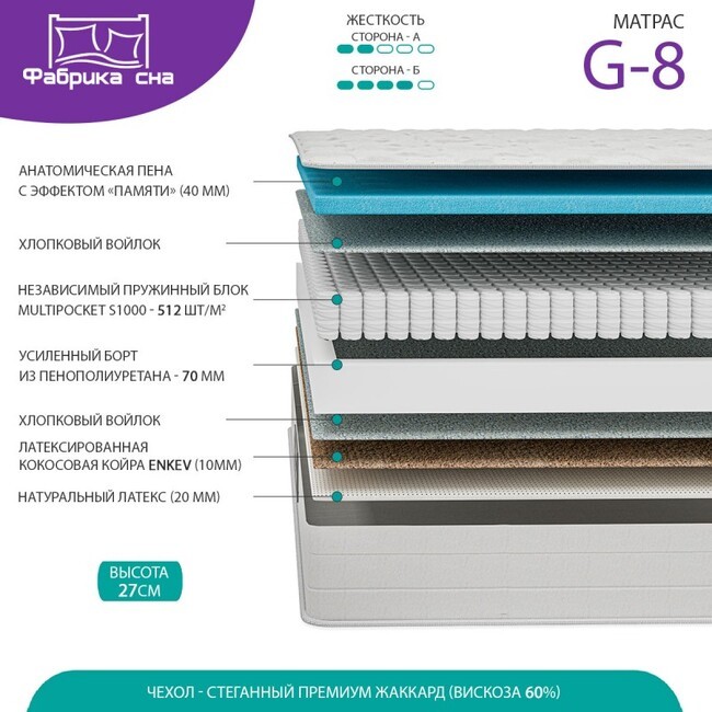 Чехол выполнен из прочной, приятной на ощупь, износостойкой жаккардовой ткани с вискозой (60%),простеганной на объемном холконе 600гр в сочетании с вязкоэластичной пеной. Благодаря чему вматрасе создается дополнительный анатомический слой, продлевается срок эксплуатации, изделиеприобретает неповторимый внешний вид. -