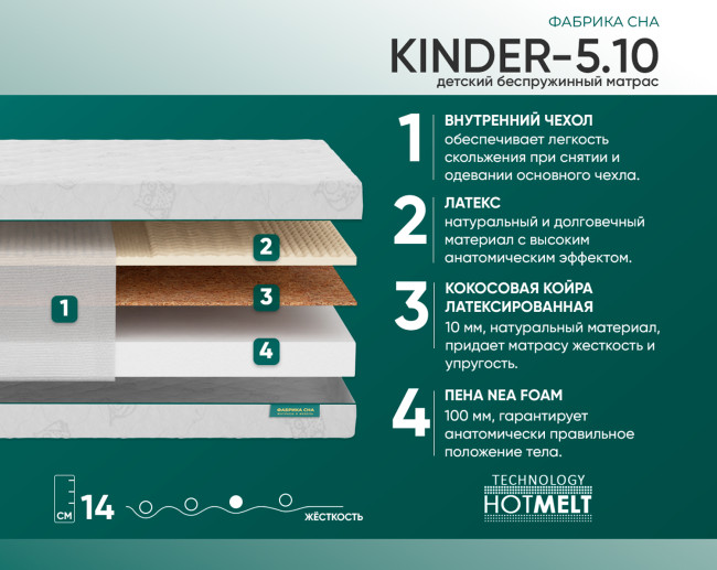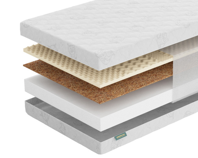 Кокосовая койра придаёт необходимую жесткость матрасу, а натуральный латекс в свою очередь смягчает поверхность, делая её сбалансированной и комфортной для здорового сна ребёнка.
